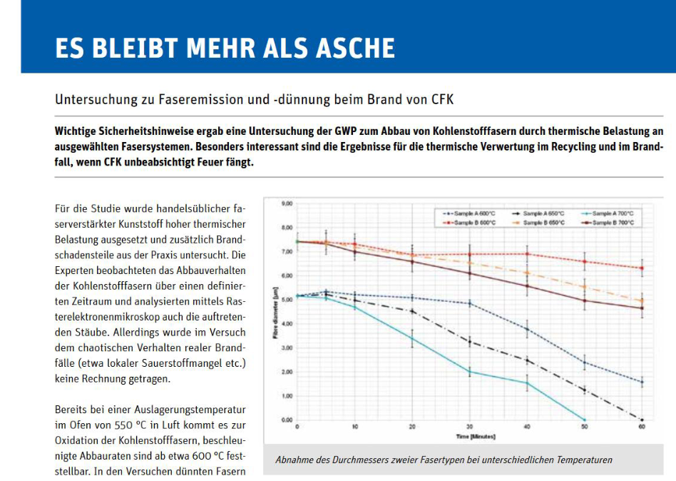 Wichtige Sicherheitshinweise ergab eine Untersuchung der GWP zum Abbau von Kohlenstofffasern durch thermische Belastung an ausgewählten Fasersystemen. Ein Artikel von Dr. Stefan Loibl im Carbon Composites Magazin. Lesen Sie den gesamten Artikel hier PDF