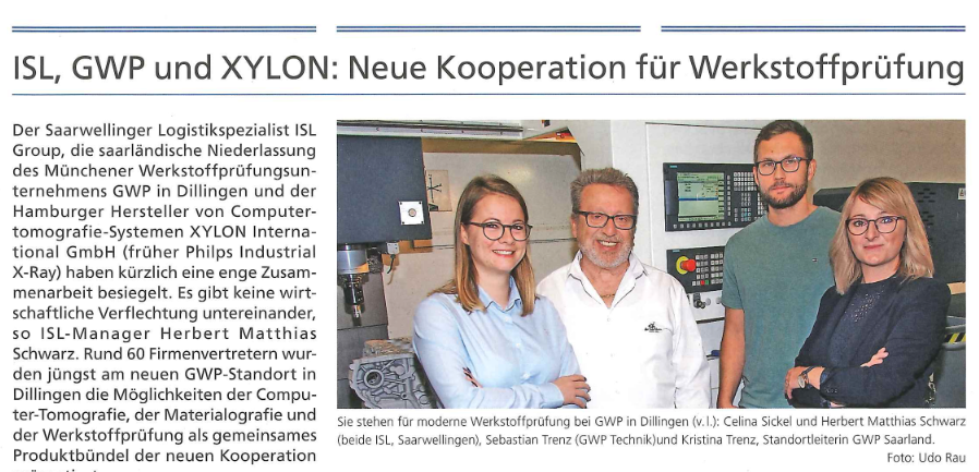 Der Saarwellinger Logistikspezialist ISL Group, die saarländische Niederlassung des Münchener Werkstoffprüfungsunternehmens GWP in Dillingen und der Hamburger Hersteller von Computertomografie-Systemen XYLON International GmbH haben kürzlich eine enge Zusammenarbeit besiegelt. Lesen Sie den gesamten Artikel hier PDF