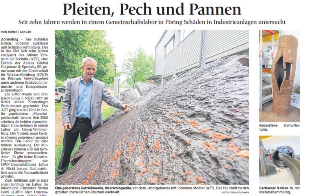 In Zorneding werden beschädigte und zerstörte Industrieteile untersucht, aber auch vorsorgliche Analysen erstellt. Ein Artikel aus der Süddeutschen Zeitung. Lesen Sie den geanzen Antikel hier PDF