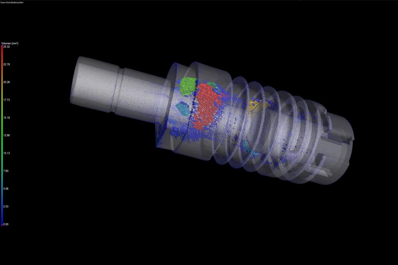 Die CT-Analyse arbeitet mit extrem hoher Auflösung und ermöglicht so die Darstellung kleinster Defekte bis in den Mikrometerbereich. Die so gewonnenen 3D-Daten werden anschließend mit spezieller Software ausgewertet, die automatisch Poren und Lunker erkennt und analysiert. Die Defekte werden nach kritischen Parametern wie Volumen, Anzahl, Verteilung und Entfernung zur Oberfläche untersucht. Dies liefert wertvolle Informationen für die Qualitätsbewertung und hilft, die Gussteile auf mögliche Schwachstellen hin zu überprüfen.